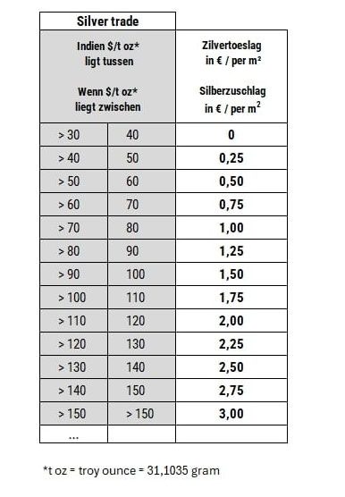 Gebaseerd op de maandgemiddelde zilverprijs  voor februari van $ 81,40 per troy ounce, wordt vanaf 1 maart 2026 een zilvertoeslag van € 1,25 per vierkante meter op spiegelglas toegepast. Dit bedrag staat gespecificeerd op de factuur.